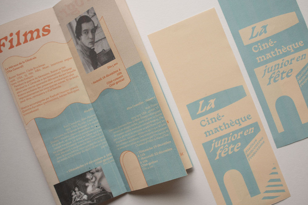 Création de l’identité visuelle de La Cinémathèque Junior en Fête!, organisé par La Cinémathèque de Toulouse. L'aspect architectural renvoie autant à la composition graphique qu'au cinéma. Le traitement "traditionnel" renvoie à la dimension manuelle des ateliers mais aussi au travail des réalisateurs précurseurs Le dépliant se compose de 2 feuilles, superposés, sur les deux côtés se trouvent des marques-pages (évitant ainsi les chutes).