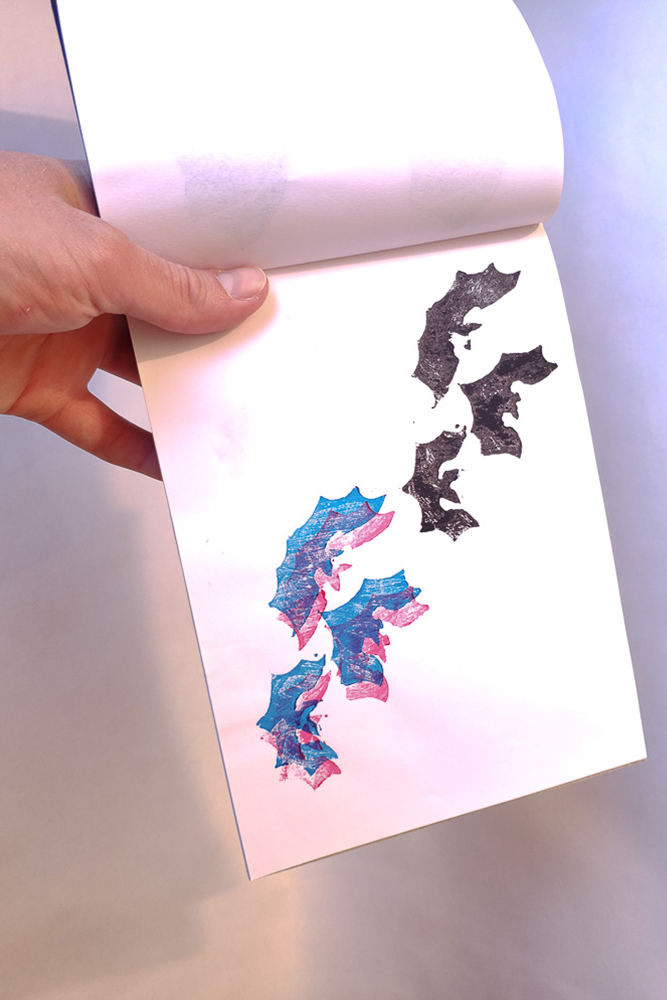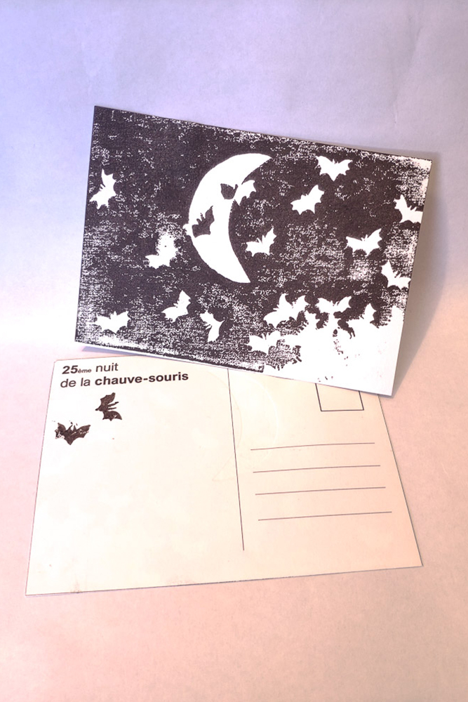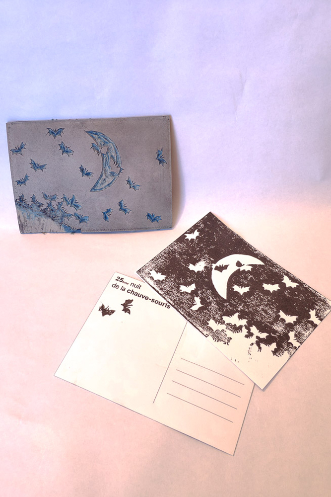 Création d’une mini édition promotionnelle pour la 25ème Nuit de la Chauve-souris porté sur la prévention et la protection de cet animal. Mon intention dans cette linogravure était de mettre les chauves-souris en lumières par un contraste noir et blanc pour les faire surgir de l’ombre. La carte postale, choisie comme support de diffusion, est donc totalement envahi par ces animaux. J’ai également relié un petit carnet pour pouvoir répertorier mes recherches graphiques sur les chauves-souris.