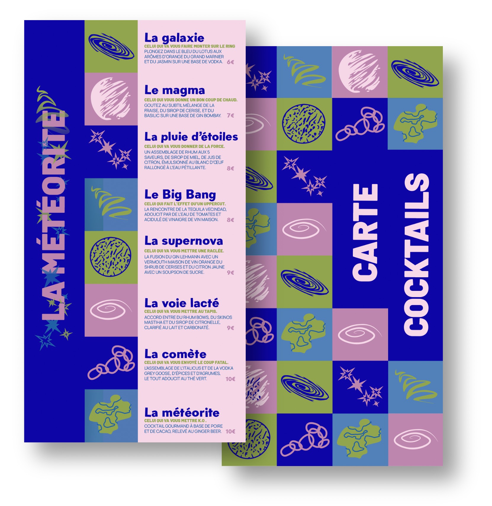 Création de la carte de cocktail et de packaging de canettes du bar "la météorite" dont le thème est l’astronomie.
