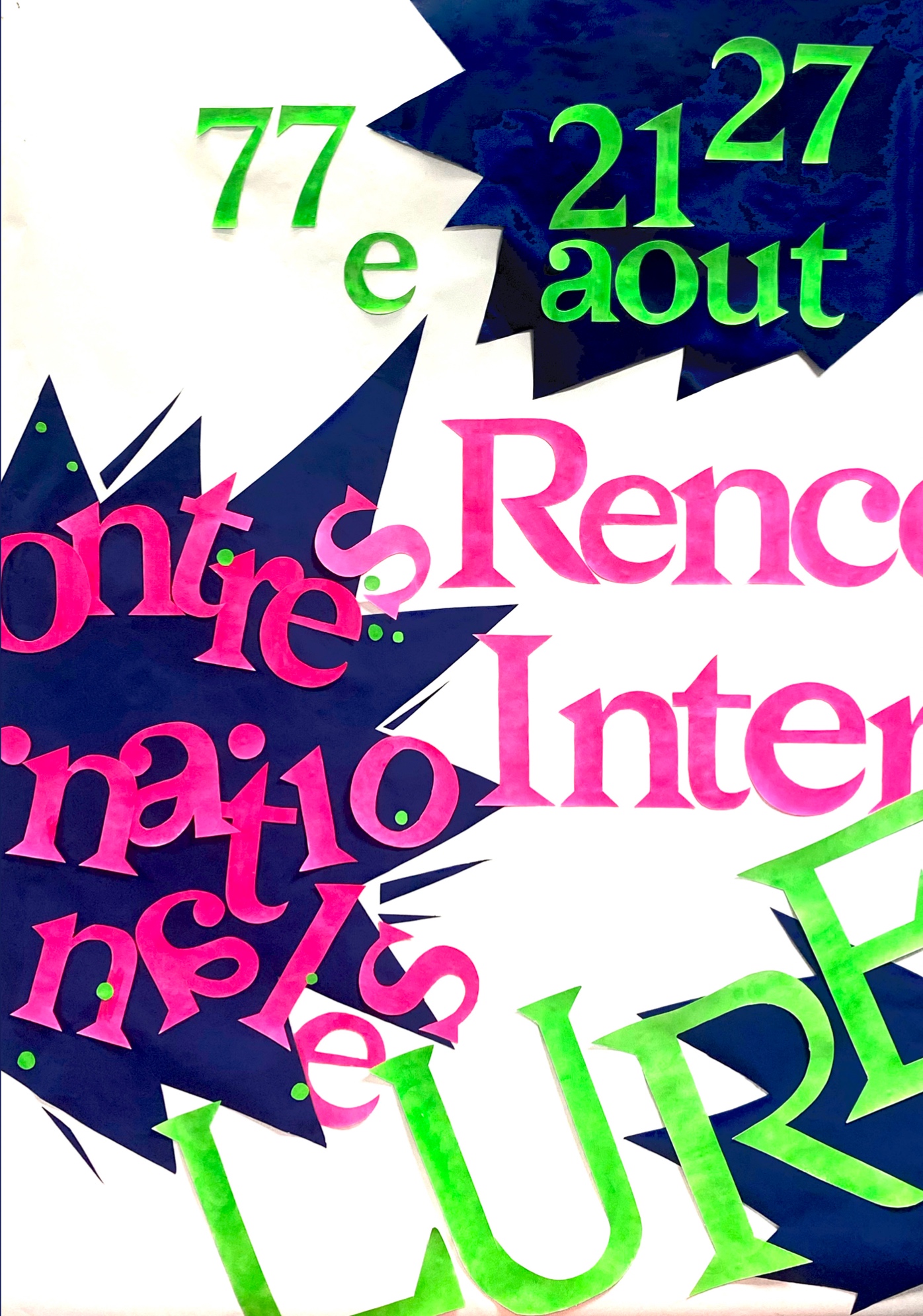 Création d’une affiche (faite à la main) pour un design impactant où le but était de faire de la typographie une fête, en générant une forte intensité, en jouant avec l’excès jusqu’à en déborder. Le thème annuel des rencontres de Lure était « l’évolution, la révolution ». Alors l’idée de « rencontres internationales » coupées en deux a pour sémantique de représenter une tension entre passé et futur.