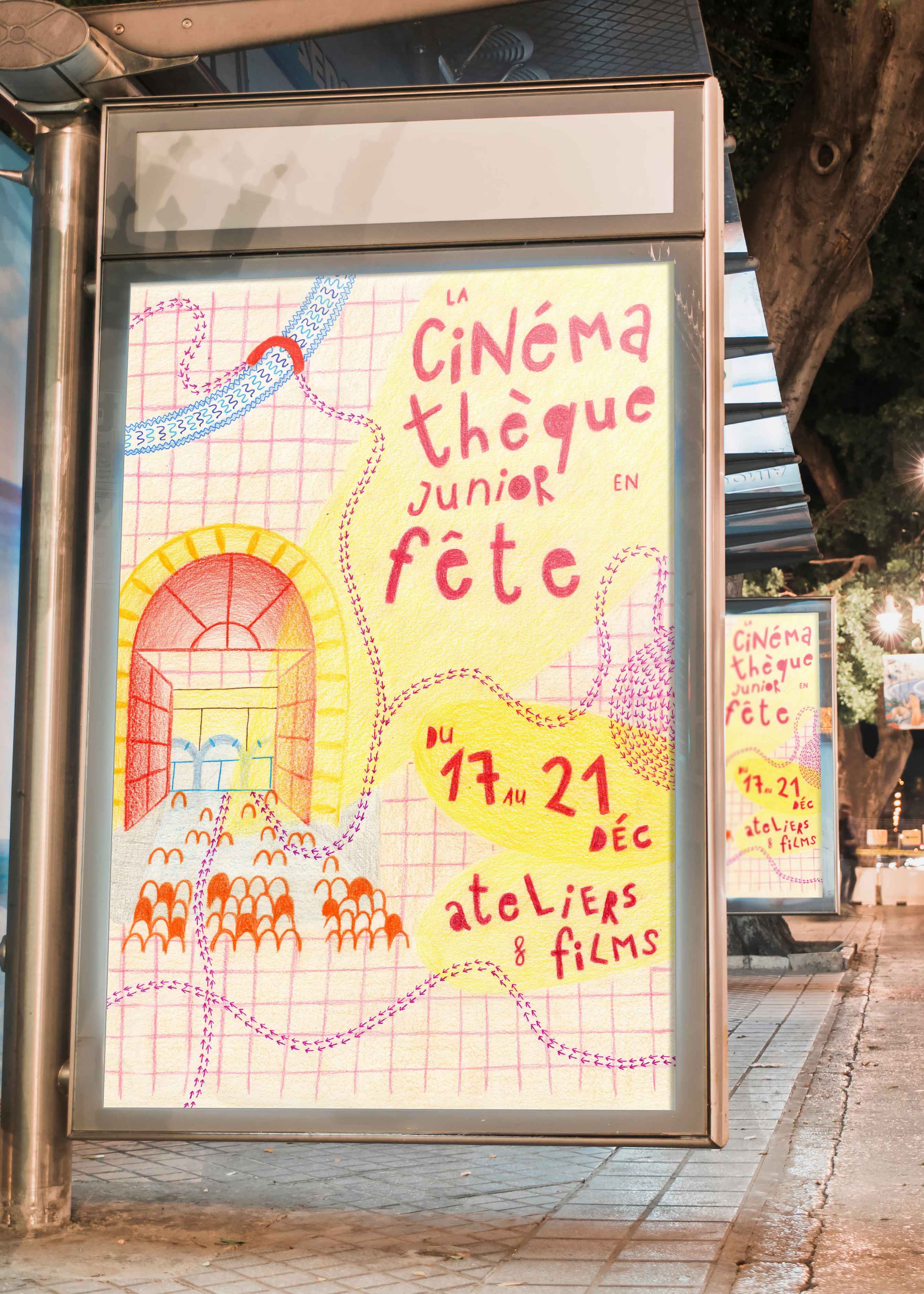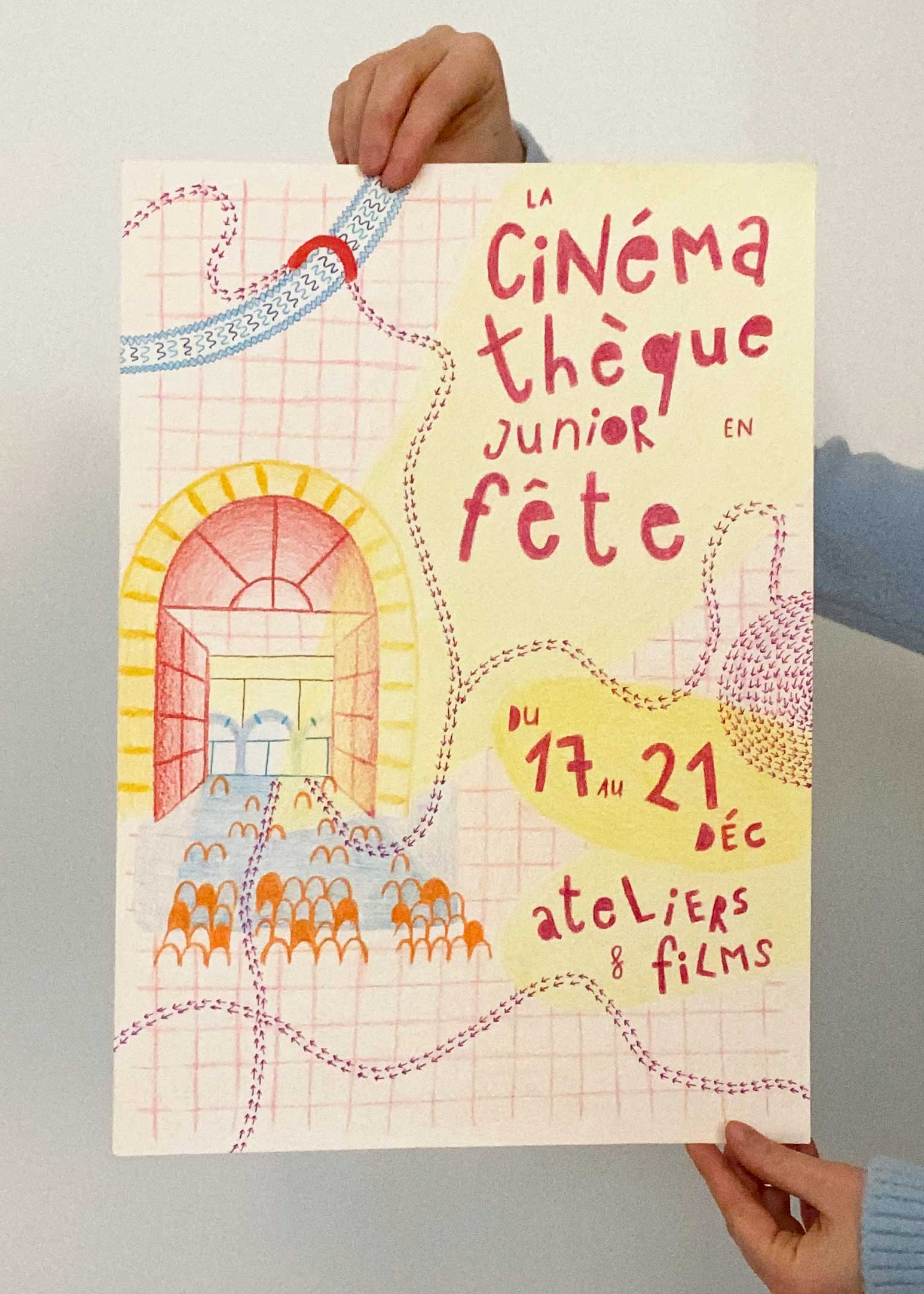 C’est alors que j’ai choisi de travailler en 2 parties, j’ai d’abord travaillé pour la cible des parents et grands-parents… Je voulais que la cinémathèque soit reconnaissable comme un lieu emblématique de Toulouse, pour moi, lors de notre visite, l’élément phare qui m’a le plus interpelée c’est la grande cour, avec cette grande porte rouge tout devant. J’ai alors choisi de m’en inspirer et d’en faire mon égérie pour mon l’affiche.