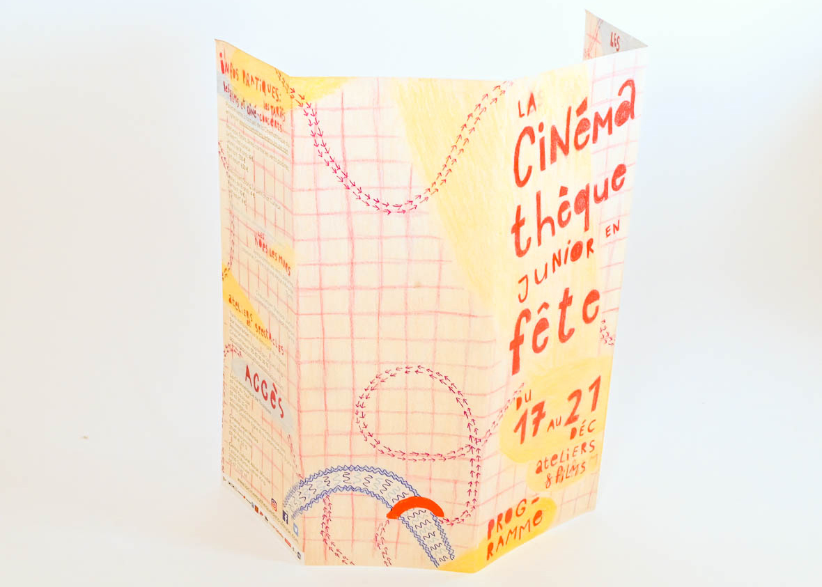 Le dépliant fonctionne de la même manière que l’affiche, grâce aux flèches c’est une invitation à découvrir la programmation, ainsi que la cinémathèque par la même occasion.