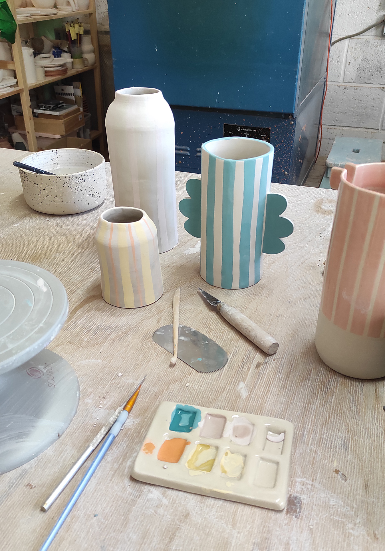 Après avoir passé plusieurs années à expérimenter la poterie de mon côté sur le coin d'une table; j'ai eu la chance de passer 2 mois aux côtés de Camille Esnéee, designer céramique à Rennes.