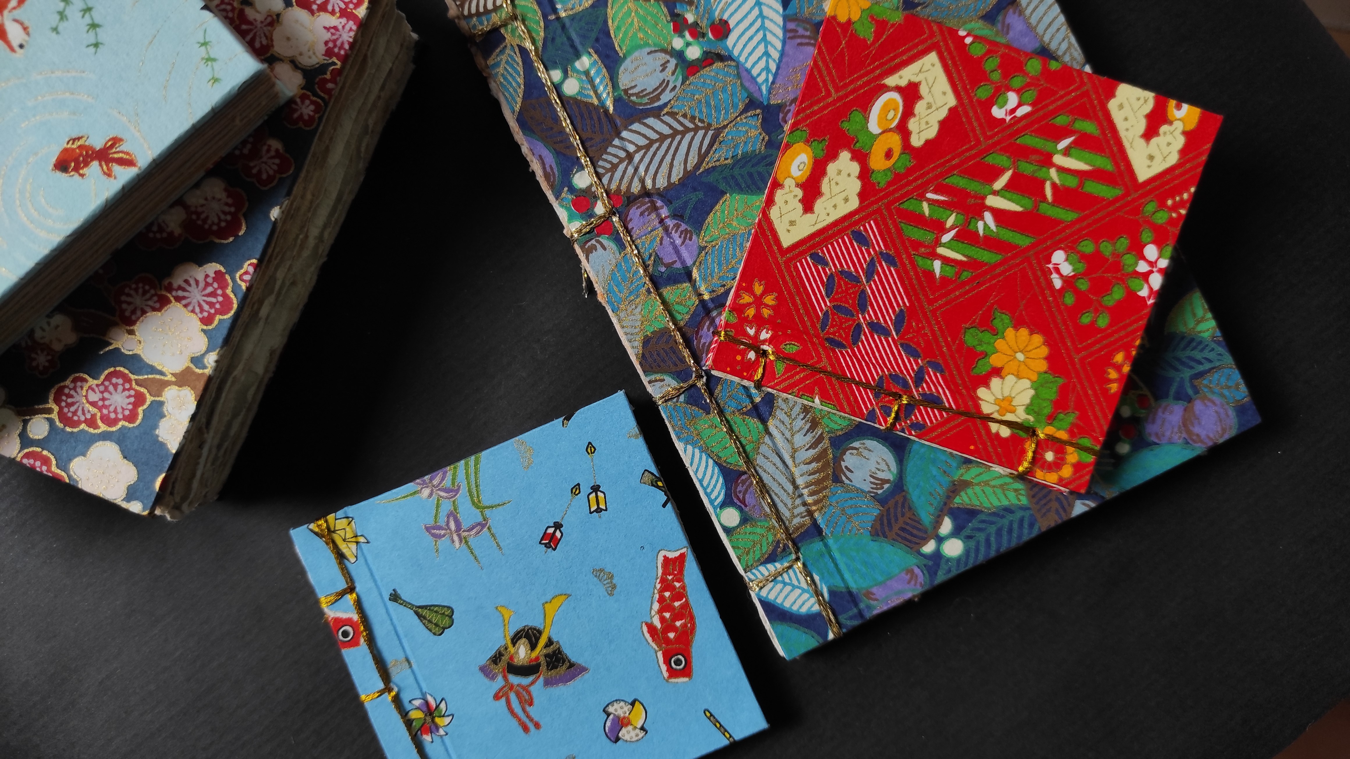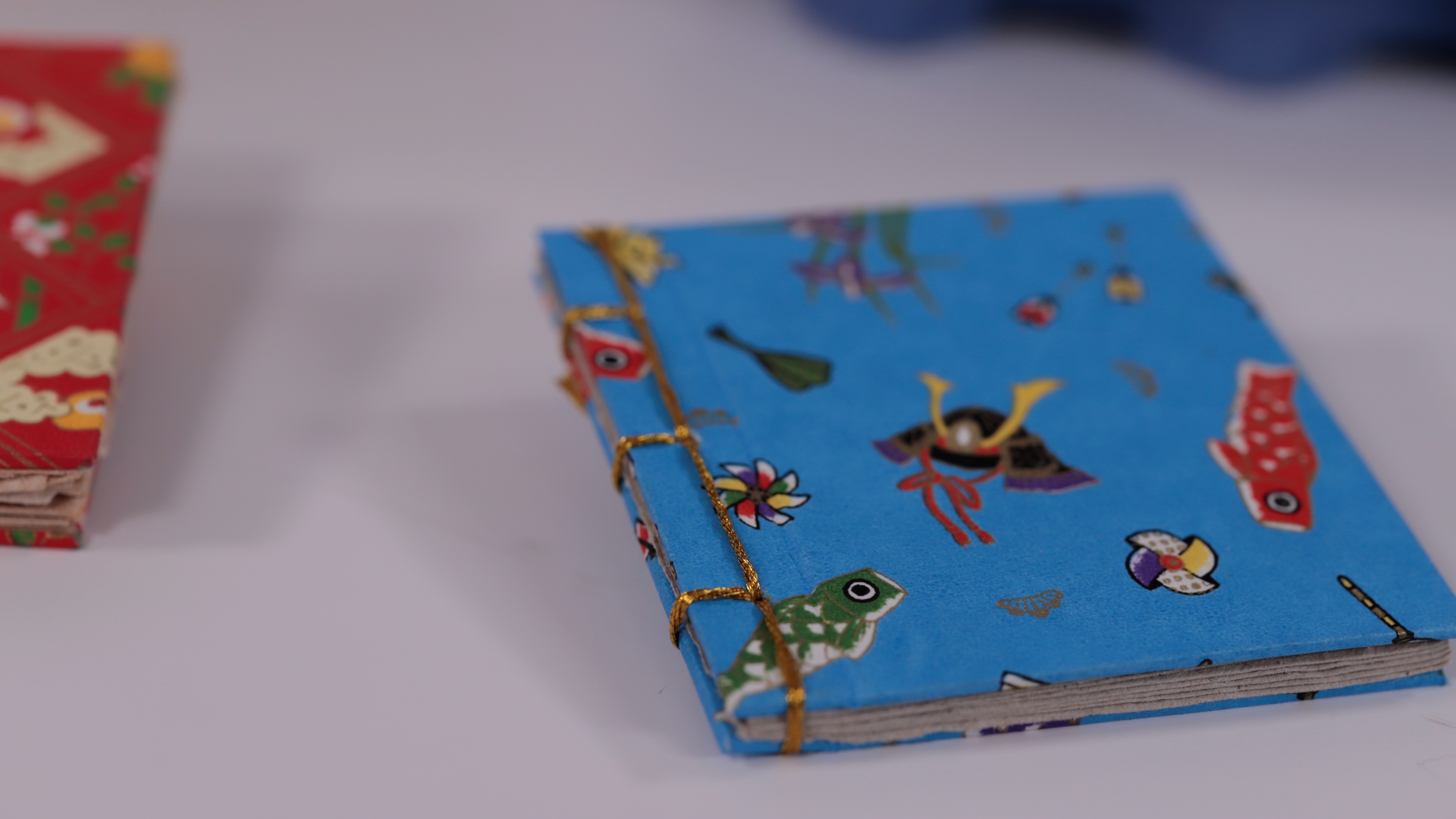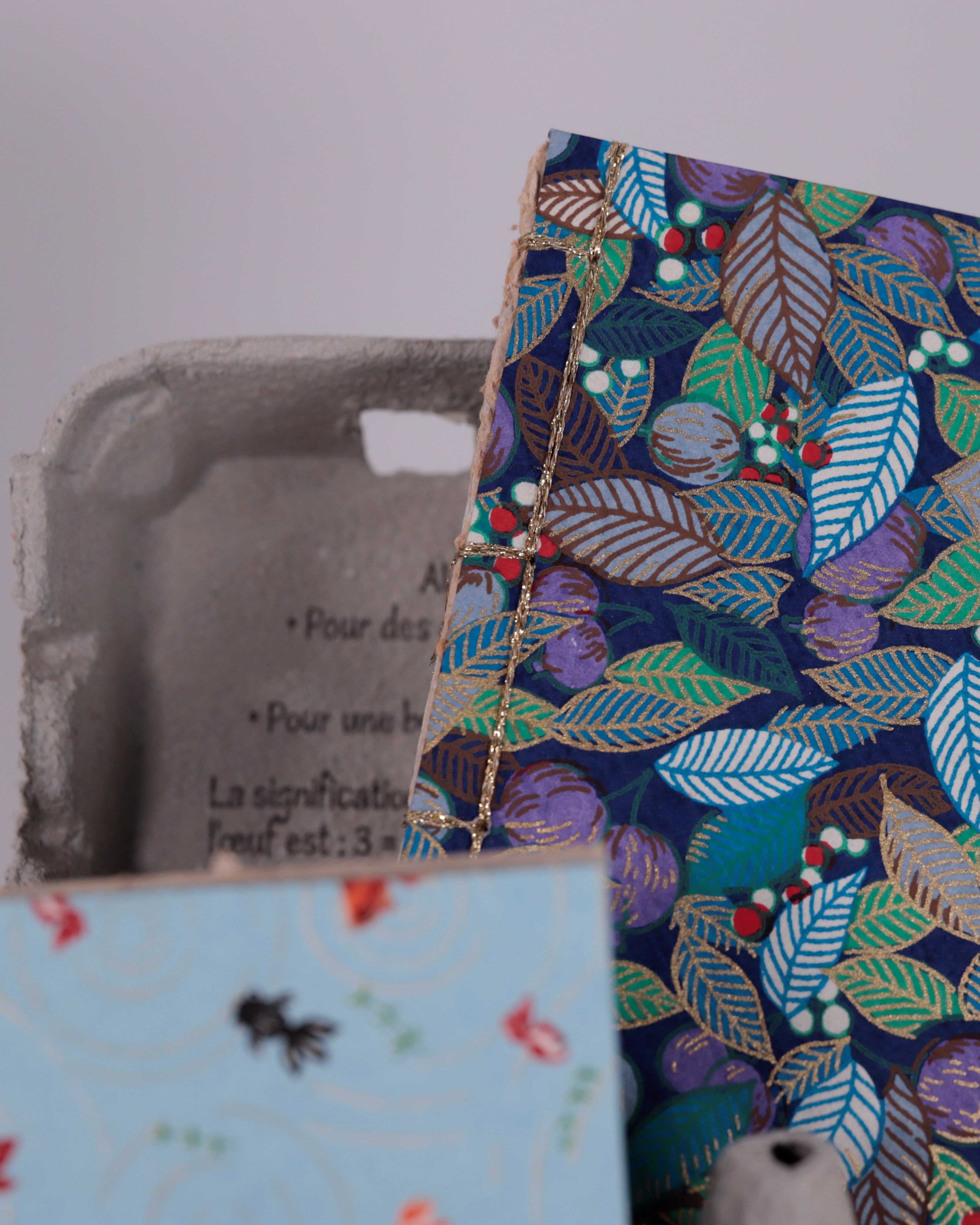 J'ai expérimenté la fabrication de papier en utilisant des boites d'oeufs. J'ai obtenue des feuilles naturellement colorées grâce aux différentes boites. Je les ai aassemblé avec une reliure japonnaisse et une couverture en papier washi. J'ai pu approfondir mes connaissances en reliure en réalisant 1 semaine de stage dans un atelier de reliure et de restauration de vieux livres.