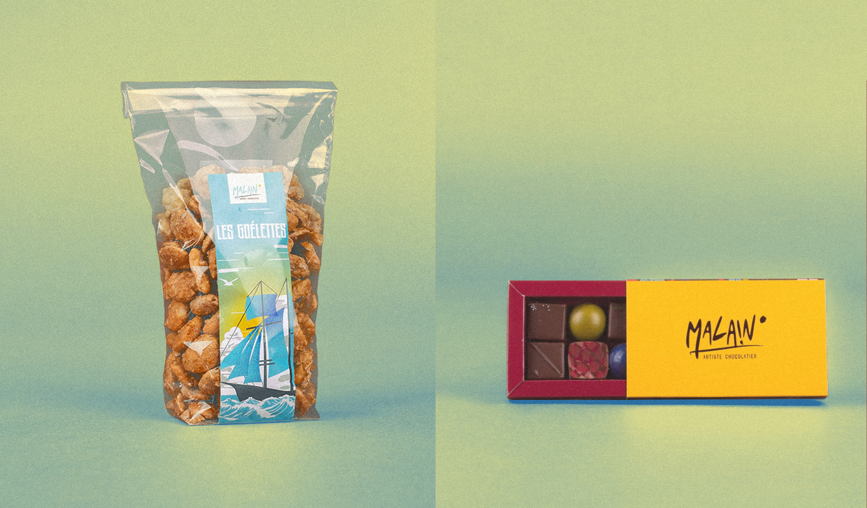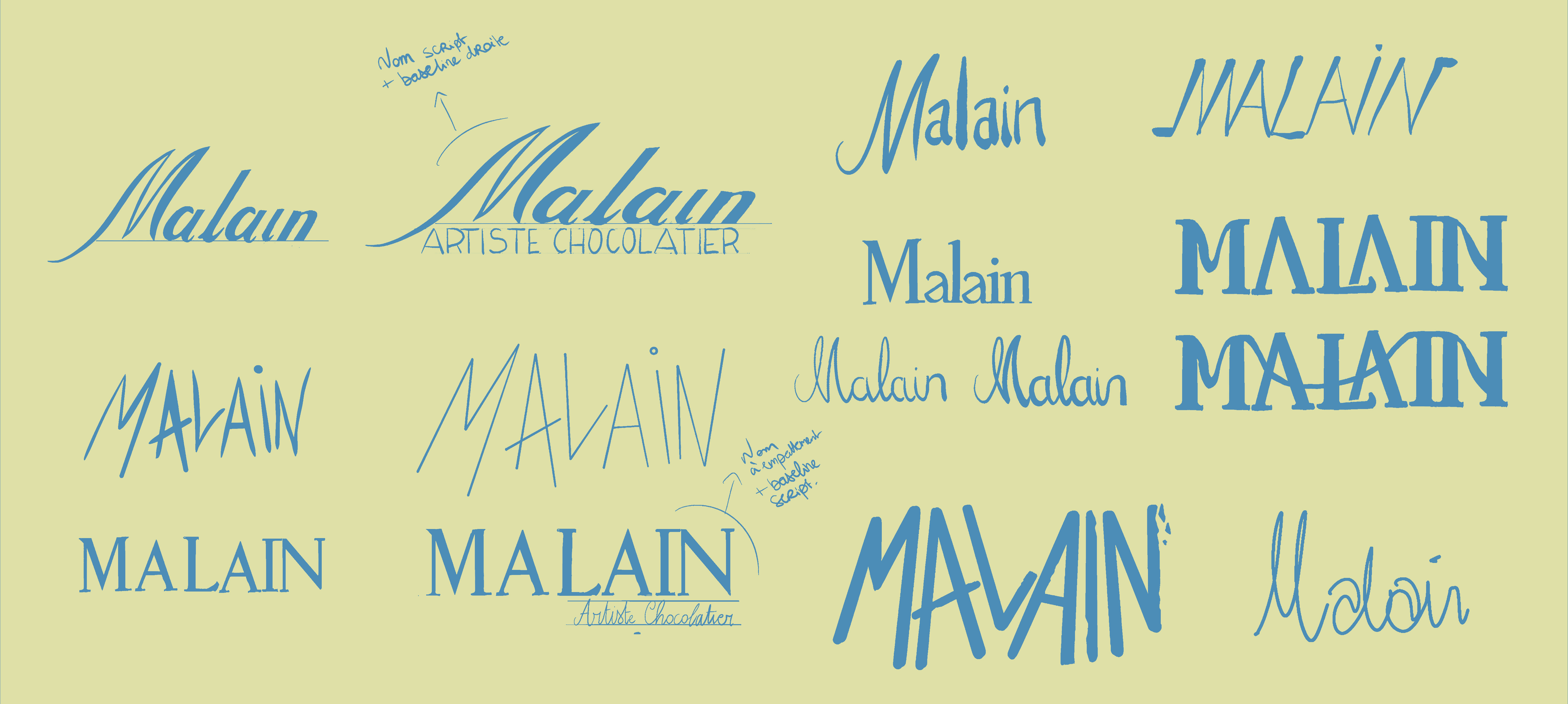 During my internship at Studio M-A, I was charged to design the identity of a chocolate maker : Malain. The chocolate artist needed a new logo and an adaptable graphic charter for his packaging. I worked on several logo researches and created a packaging taht included a label to be attached on plastic packaging.