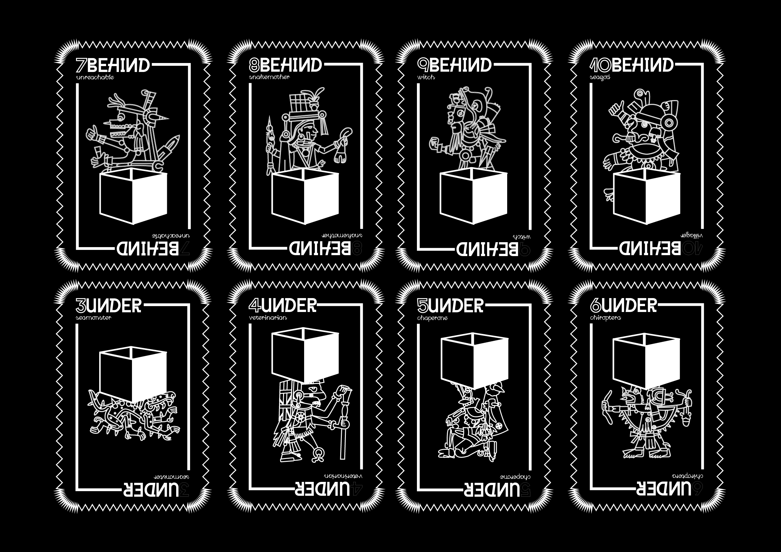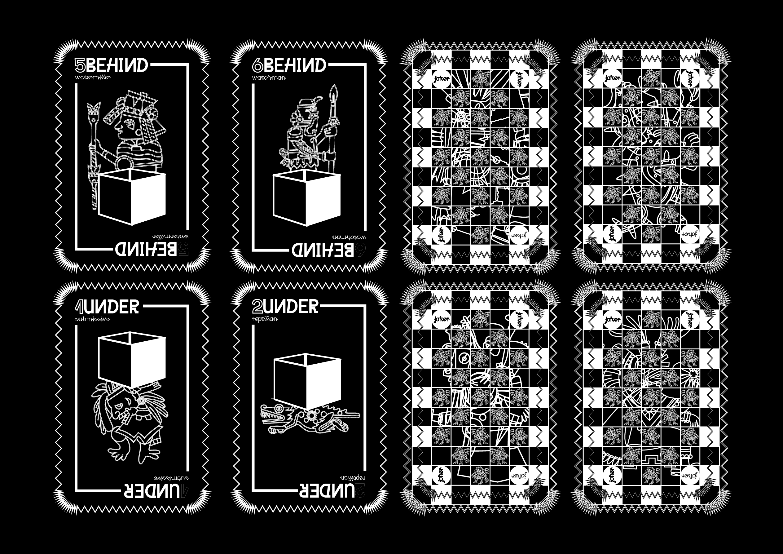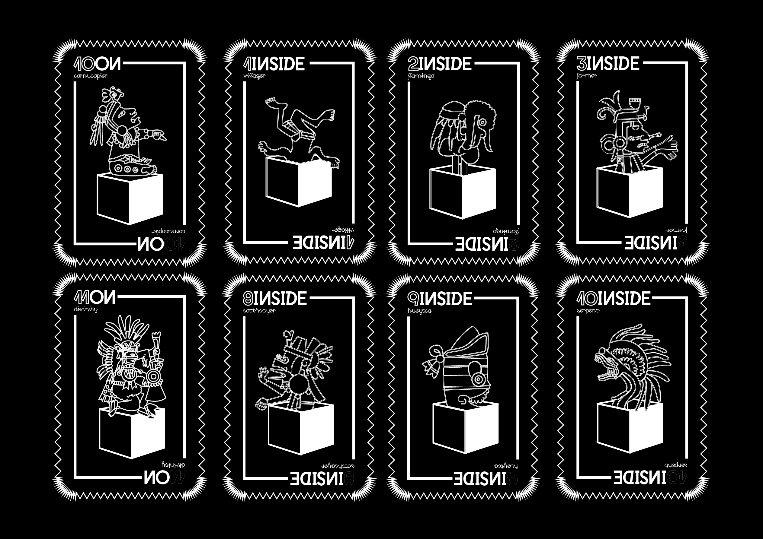 L’étape d’illustration des faces des cartes a été la plus longue, car il fallait repenser plus de 40 illustrations représentant des personnages et leurs rôles dans la société aztèque. Le design choisi est sobre, avec des contours doublés et des motifs rappelant ceux de la face. Chaque carte présente une illustration en contour, accompagnée d’une typographie miroitée à vocation informative.