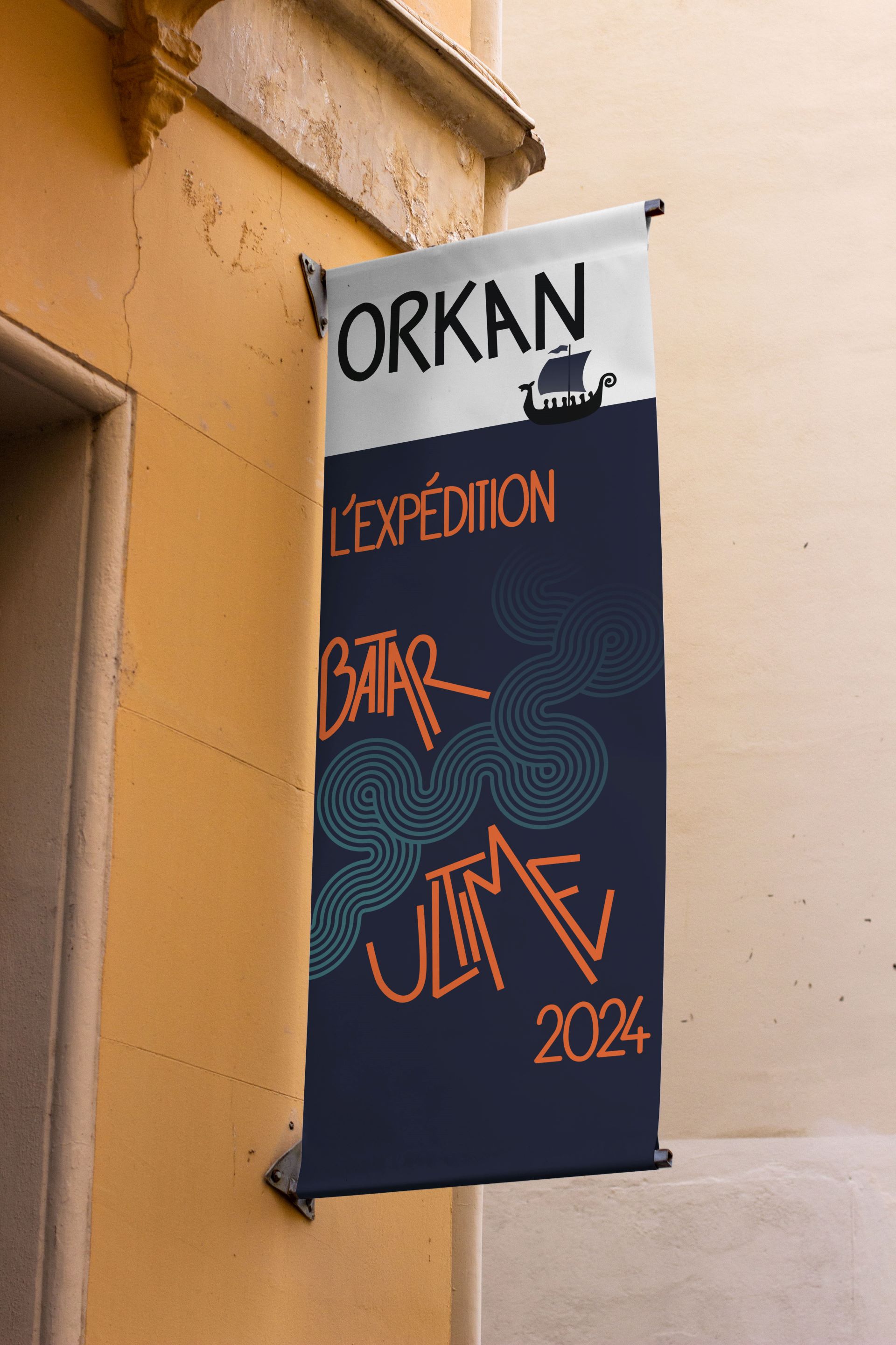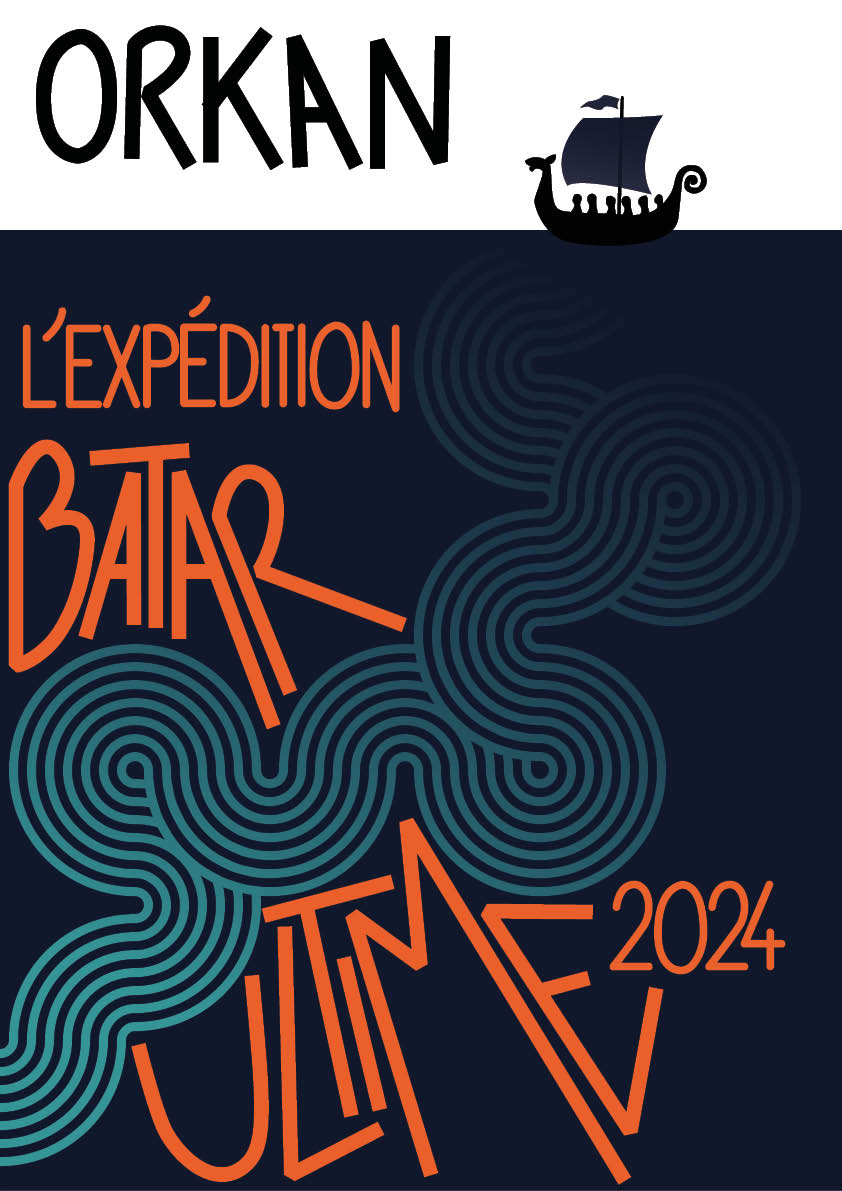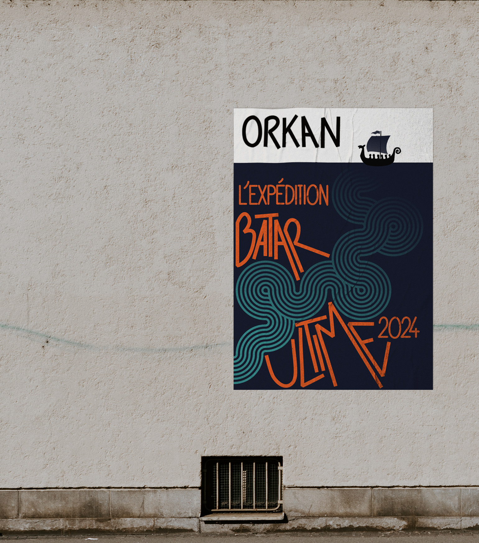 Dans le cadre de l’expédition en drakkar de l’association Batar, j’ai décidé de mettre en avant le courage des vikings lors de leurs longs périples en mer. Un bateau navigue sur une eau qui semble calme, alors que sous la surface se cache la menace des fonds marins, cette créature aquatique dans la mythologie nordique appelée le Jörmungandr. Les lettres aux angles saillants et cette couleur orangée sur fond sombre appuient ce sentiment de danger.