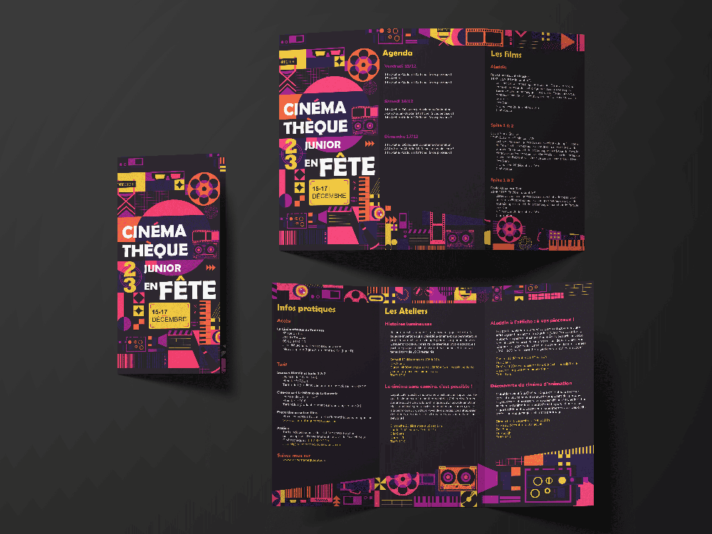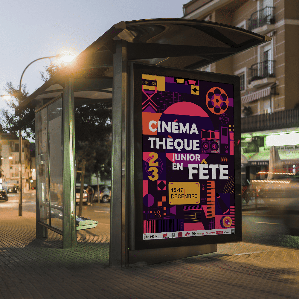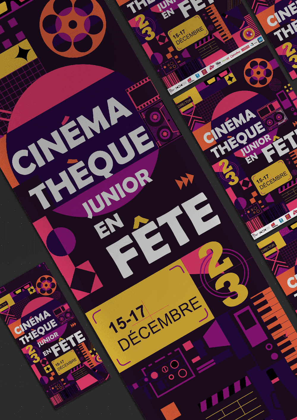 Réaliser un système graphique (affiches adhésives, programme, et supports web) pour évènement La Cinémathèque Junior en fête proposé par La Cinémathèque de Toulouse, du 15 au 17 décembre 2023.